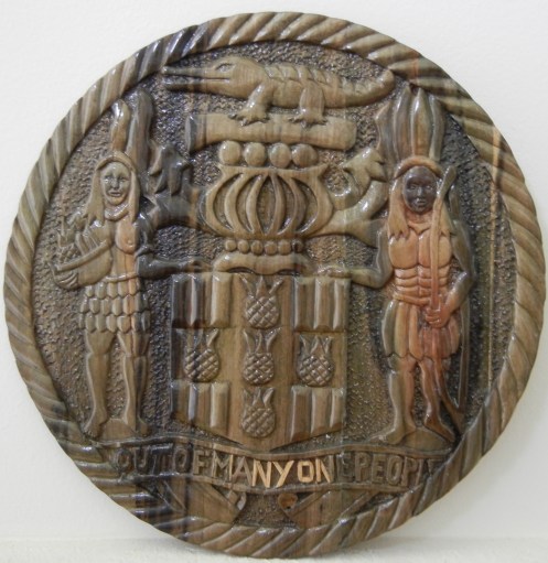 The carving below was given to me by my Dad and was hand-made with crude tools from the Lignum Vitae Tree. The Coat of Arms is boasting its stunning portrayal of the Crest, the Crocodile; Arawak Indians, the first natives of Jamaica; and five pineapples, for the economic status of that era and as an indigenous fruit. The male Indian is holding the main hunting gear, the bow; and the female is holding a basket of bounty which also includes a pineapple. The Motto was changed from the original version of, “The two Indians will serve as one” or “Both Indies will serve Together”, to “Out of Many, One People”, due to the immense cultural groups that made the island of Jamaica home. This version of the Coat of Arms was adopted in 1962. Jamaica received its own Coat of Arms on February 3, 1661, the first of the British colony to do so.